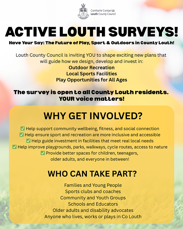 Please see the links below to three surveys that will shape the future of Sport & Physical Activity in Louth in the coming years.