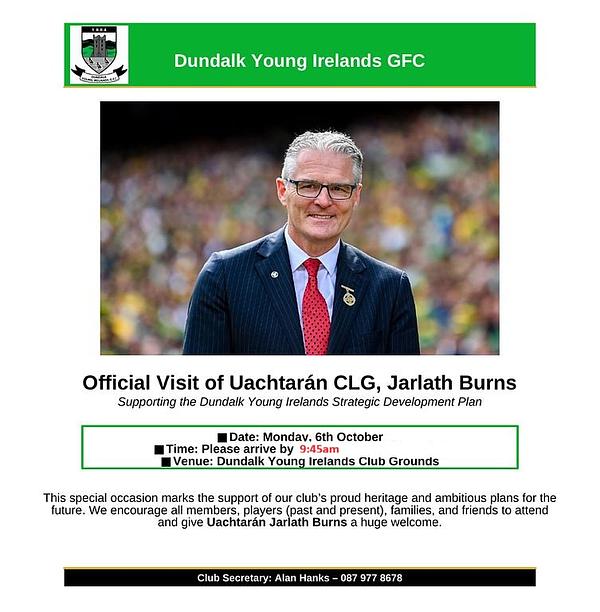 | 11:00 – 11:30 | Address from Uachtarán CLG Jarlath Burns, Presentation, photo opportunities with Uachtarán, elected representatives, sponsors and guests | Club grounds / Marquee